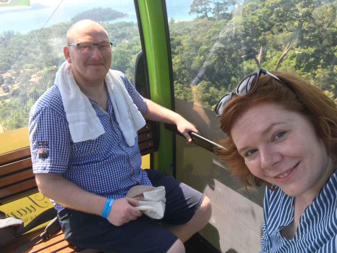 Mit dem Taxi ging es zum Oriental Village (kleiner Ort der für Touristen gebaut wurde) und mit der Seilbahn der Berg hinauf. Hat ordentlich geschaukelt und gilt als steilste der Welt. Das war ein Spaß! Dank express Lane Karten auch ganz ohne Wartezeit. Danach noch in ein Gebäude voller 3D Perspektiven und ab zum Strand. Mit dem Boot auf eine Privatinsel übergesetzt und hier lümmeln wir jetzt rum. Mit Schatten, Liegen, Duschen und Toiletten auf europäischem Niveau.