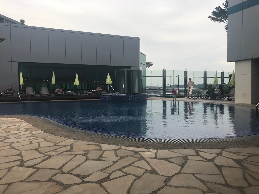 Jetzt haben wir ins Transit Hotel eingecheckt und chillen bis Mitternacht ein wenig, eben waren wir noch im Flughafen Pool.