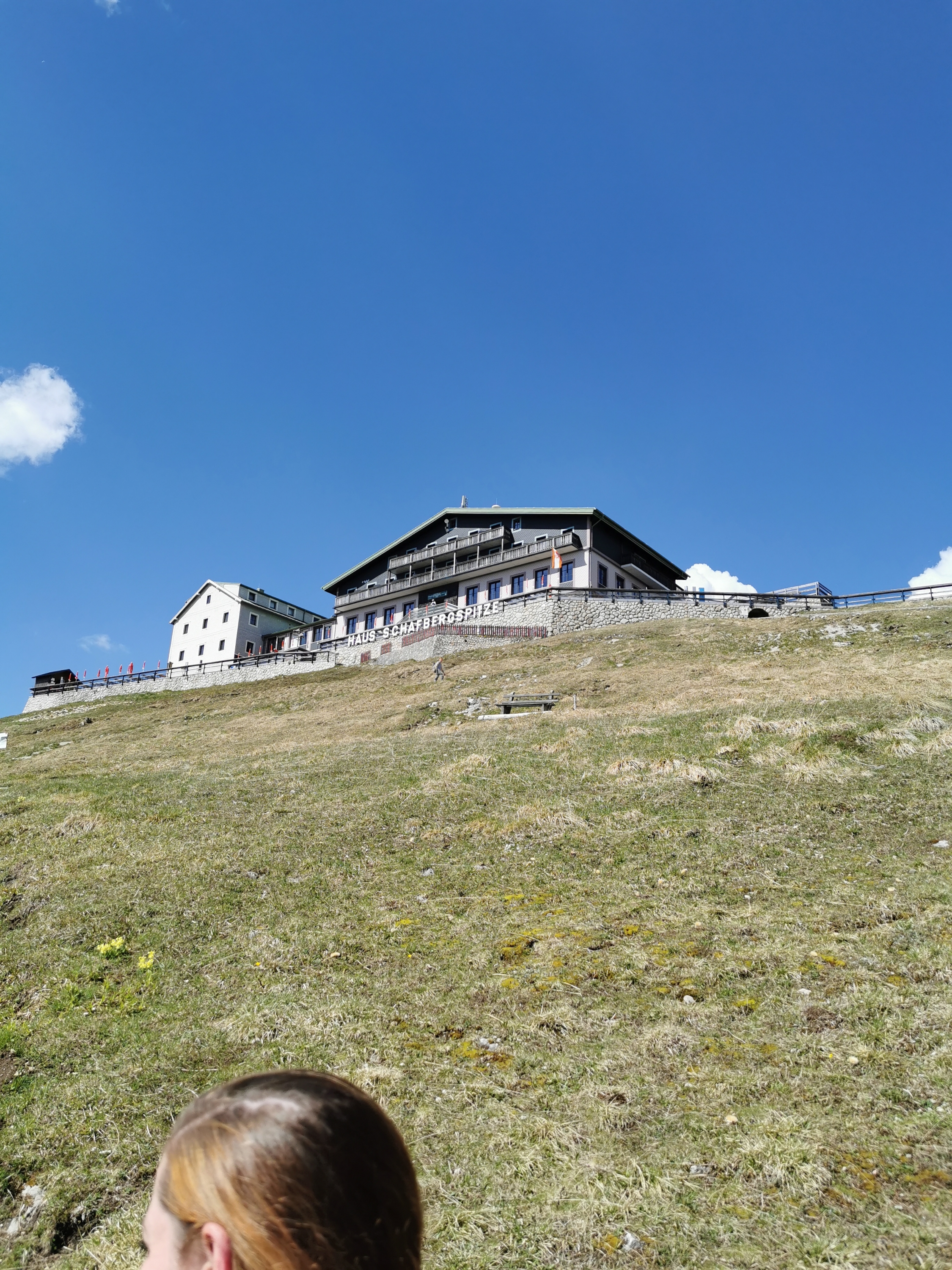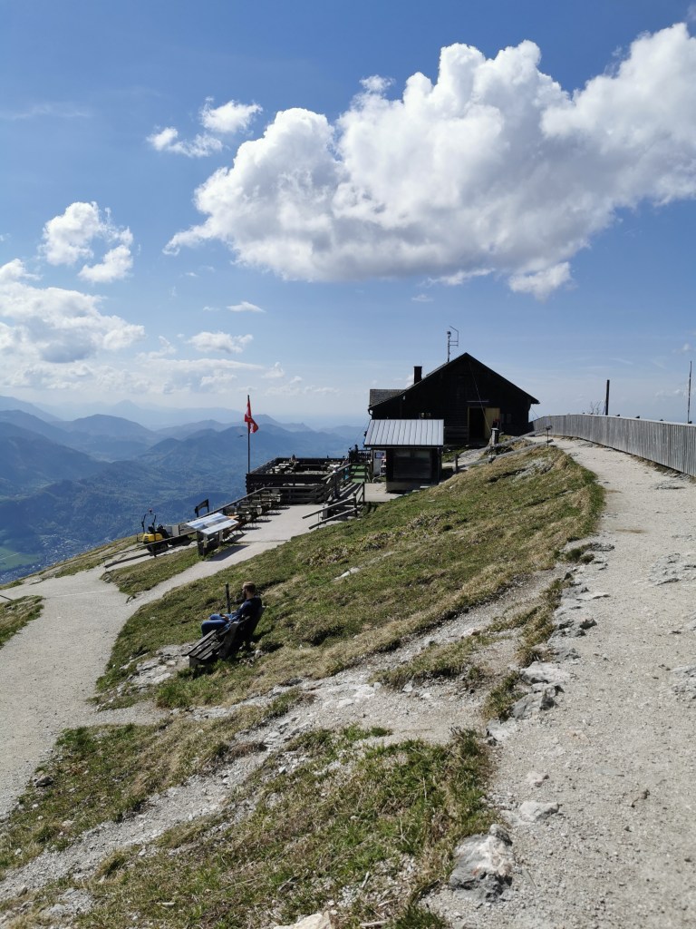Oben angekommen hatten wir 20 Minuten bis zur gebuchten Rückfahrt. Maria hat mit den Kindern eine kleine Eiswand bearbeitet, während die (halbwegs) Erwachsenen Monchis und ich noch etwas höher zur Hütte gespurtet sind, um auch über die andere Bergkante zu schauen und von dort aus Mondsee und unseren Alm Bauernhof zu bewundern.