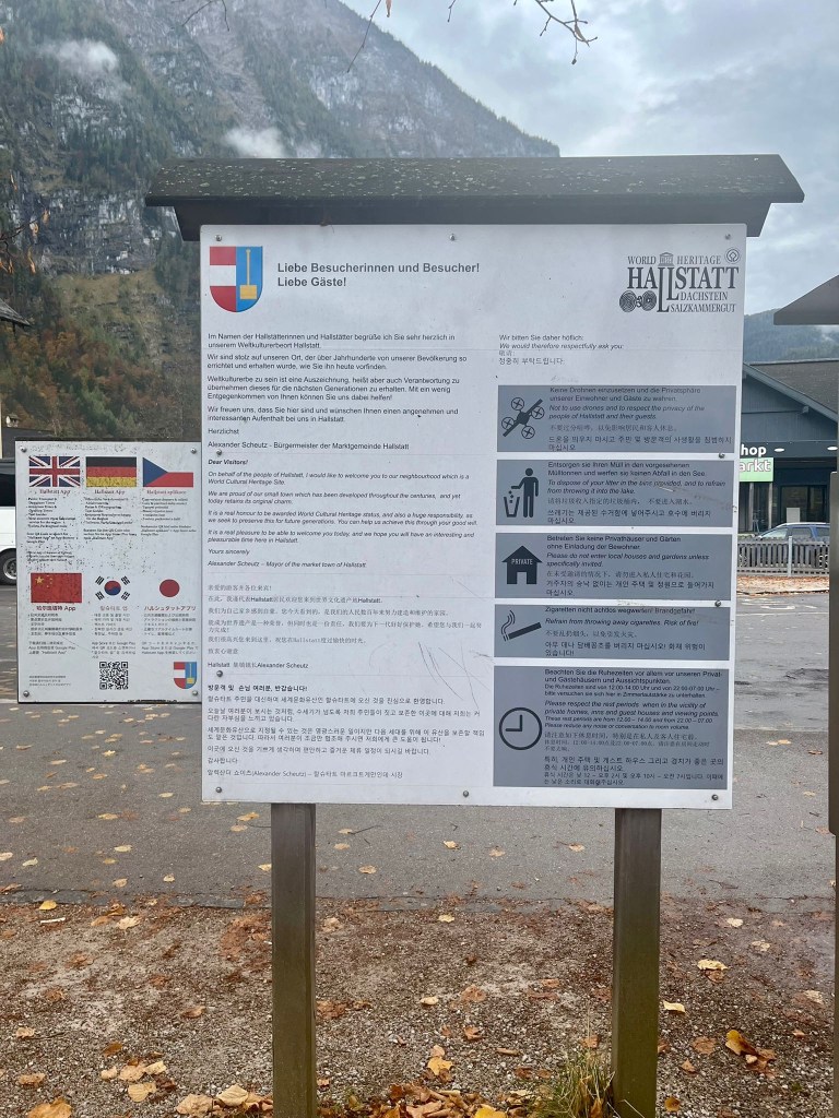 Hallstatt ist aus nicht wirklich nachvollziehbaren Gründen bei Touristenmassen gerade aus Asien unglaublich beliebt und diese überlasten den Ort in der Saison Tag für Tag. Die etwa 800 Einwohner haben pro Jahr beinahe 20.000 Reisebusse zu verkraften. Man sagt es liegt am pittoresken und historischen Bild, aber eigentlich hat Hallstatt nichts, was St. Wolfgang nicht auch in schöner hätte (gut, auch da kann es gelegentlich recht voll werden). Vor ein paar Jahren hat der Ort also entschieden das Busse mindestens 2 Stunden bleiben müssen – so vermeidet man das ganze Busladungen nur von einem Ende ans andere Latschen, 15 Minuten alles überlasten, wieder weg sind und kein Geld da lassen – gleichzeitig aber nicht mehr als 58 Busse pro Tag kommen können. Man muss sich also anmelden, 80 € pro Bus an die Gemeinde zahlen und zumindest für nen Kaffee reichen tut die Zeit allemal. Ganz schön clever.