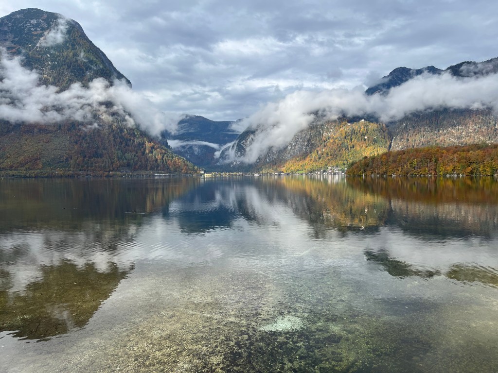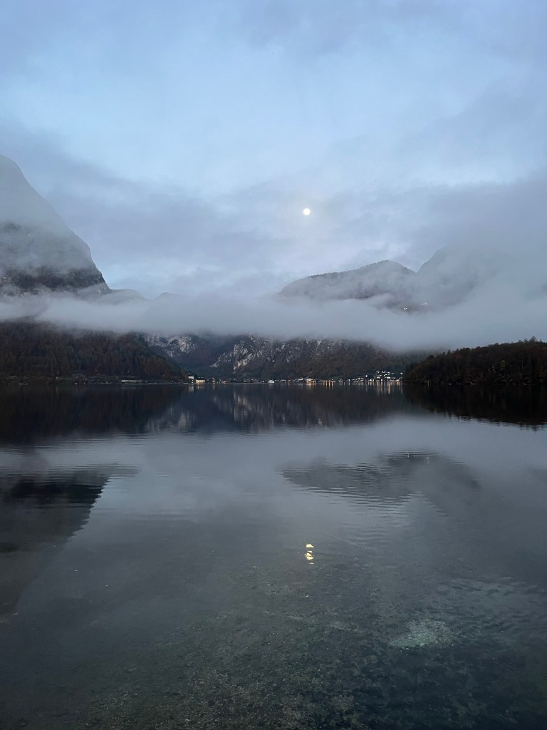 Heute morgen sind Puschel und ich wieder zum Bäcker gelaufen. Da es nachts geregnet hatte, war der Nebel höher als gestern und man konnte bis Hallstatt über den See sehen, sehr schönes Bild und alles noch recht friedlich.