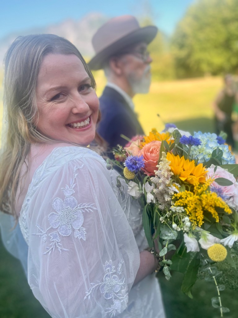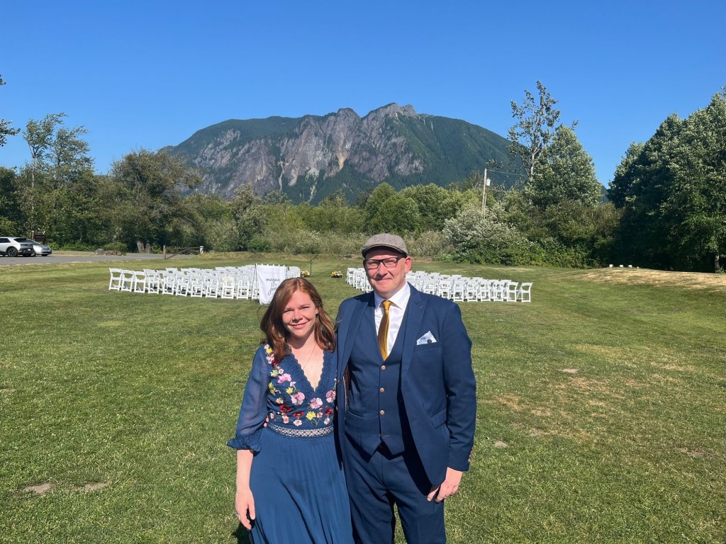 Nun waren wir also alle da. Die Gäste, der Freund, der Megan und Joey trauen sollte, ein sichtlich aufgeregter Joey, die Sonne und hinter uns der schöne Mount Si. Fehlte nur noch die Braut. Die kam dann in einem Kleid, das einfach nur Megan schrie, an der Seite ihrer Eltern zu uns und das Lachen und die Freude des Brautpaars überstrahlte alles andere.