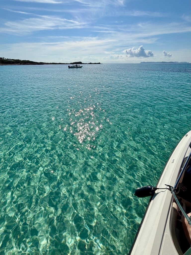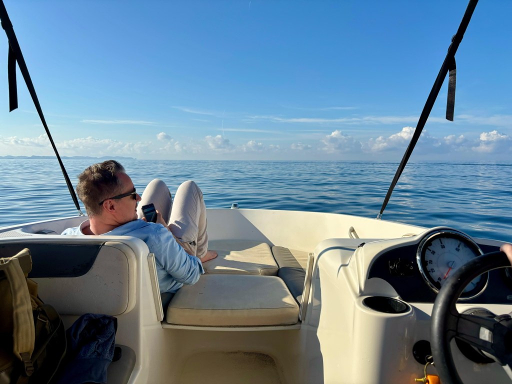 Nach einer kurzen Einweisung (du weißt wie das funktioniert? Verlier den Anker nicht, kostet 50 €), sind wir in unserer Nussschale um Colonia herum geschippert und haben uns es Trenc angeschaut.