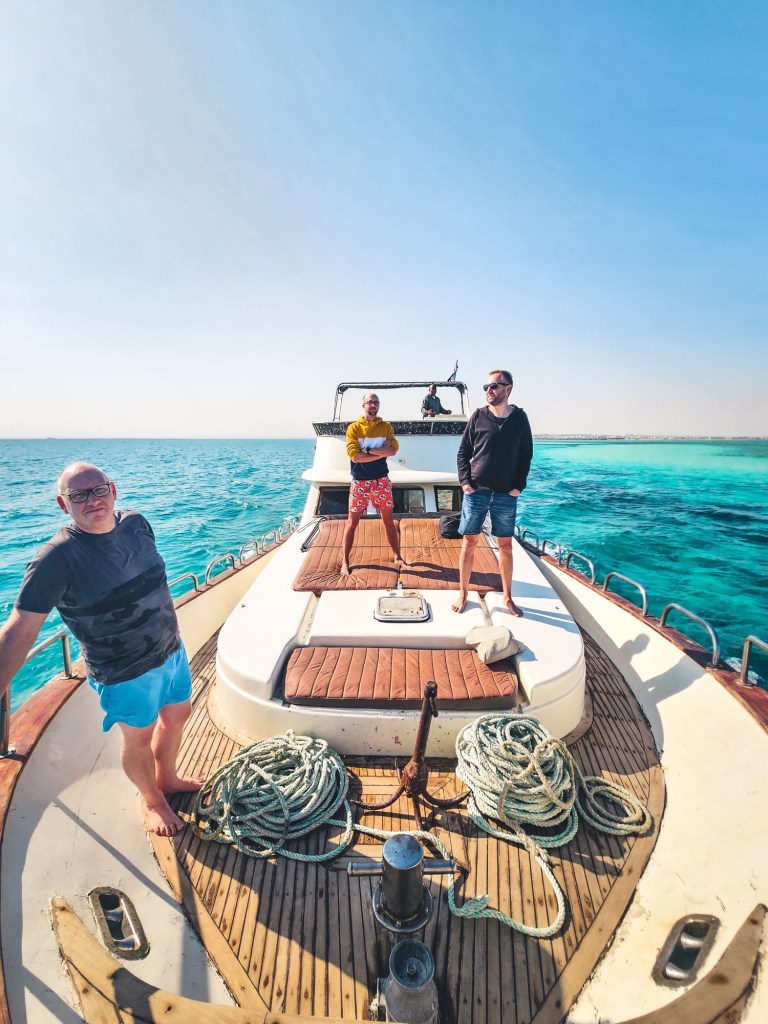 Mit dem bisher angenehmsten Transfer (ich fahr hier nicht mehr vorne mit Matze versteht mein Problem nicht) kamen wir nach 20 Minuten an der Sports Marina an und gingen an Bord der Yasser. 14 m lang, für hiesige Verhältnisse recht gut in Schuss und ein nettes Sundeck.